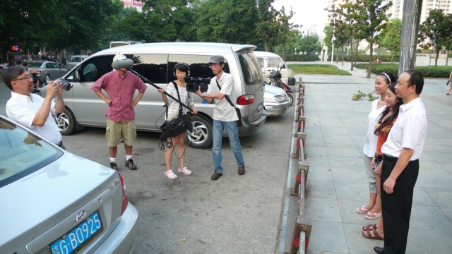 A production day can’t be complete without a scene that stands out and becomes etched in one’s mind. Here it is: on the way from the school to Mr. Zhu’s house, we were caught in a shower. Our crew followed the two families (Shumin and Vivian in the front, Mr. Zhu, his wife, and Hubert behind). As the parents walked and made small talk in the rain, we saw Vivian and Shumin holding hands together.