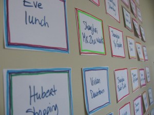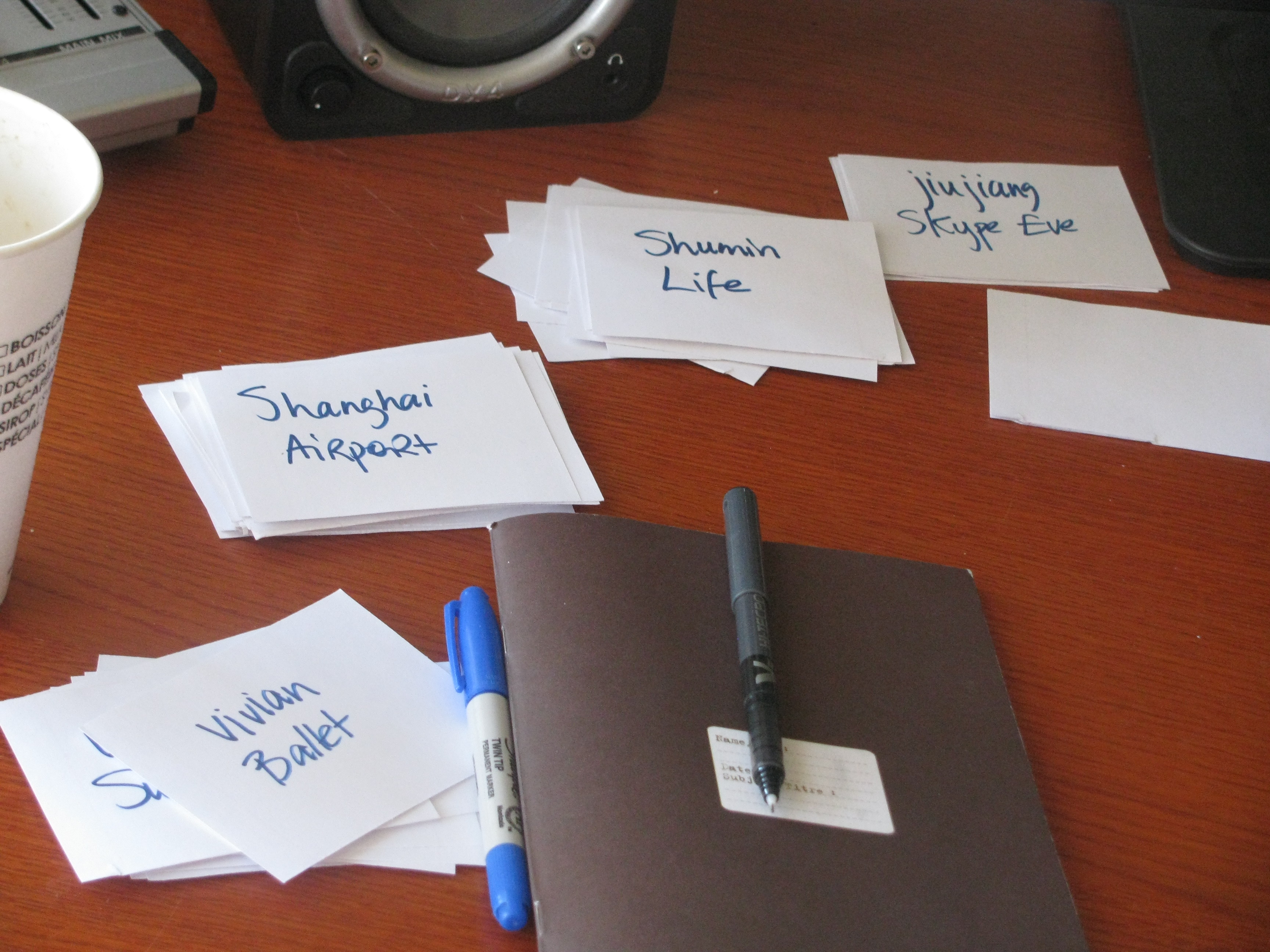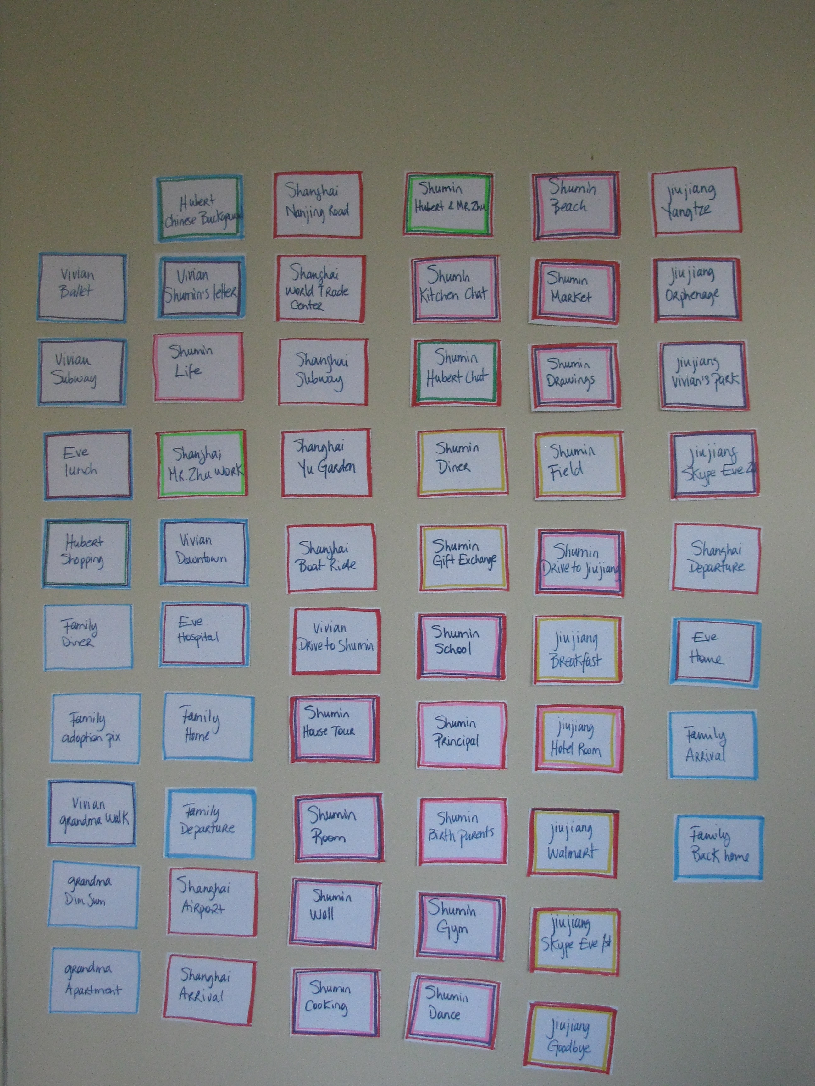Editor Catherine Legault makes cards of all the potential scenes and colour codes them – one colour for China, another for Canada and different colours depending on which ‘character’ is the main one in that scene. Our main goal is to keep the film on Vivian’s story of her return to China, the country where she was adopted from, while still highlighting the story of Shumin, a girl who was adopted locally within the same province in China around the same time. Their meeting and how it affects each of them is the story we’re working to create as a film.